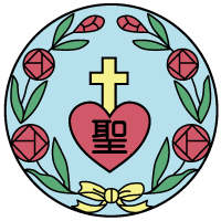イエス・キリストの*聖心(みこころ)を象徴するハートを中心として、バラの花が囲んでいます。バラの花はキリストの愛を表現し、ハートの十字架がその愛の広さ・深さを表しています。
